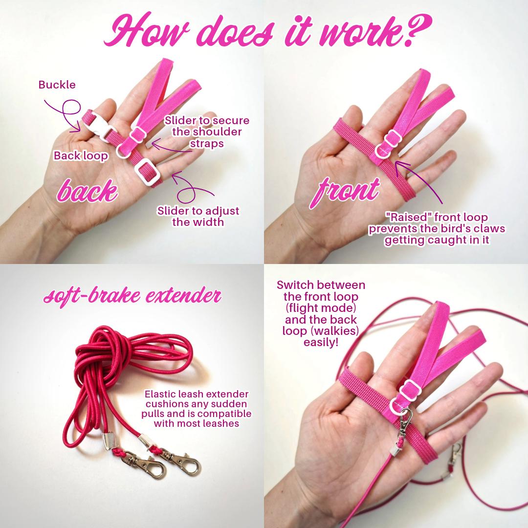 Pigeon Harness "Sophie" - Bird Flight Harness with Soft-brake Leash Extender - Hot Pink and White