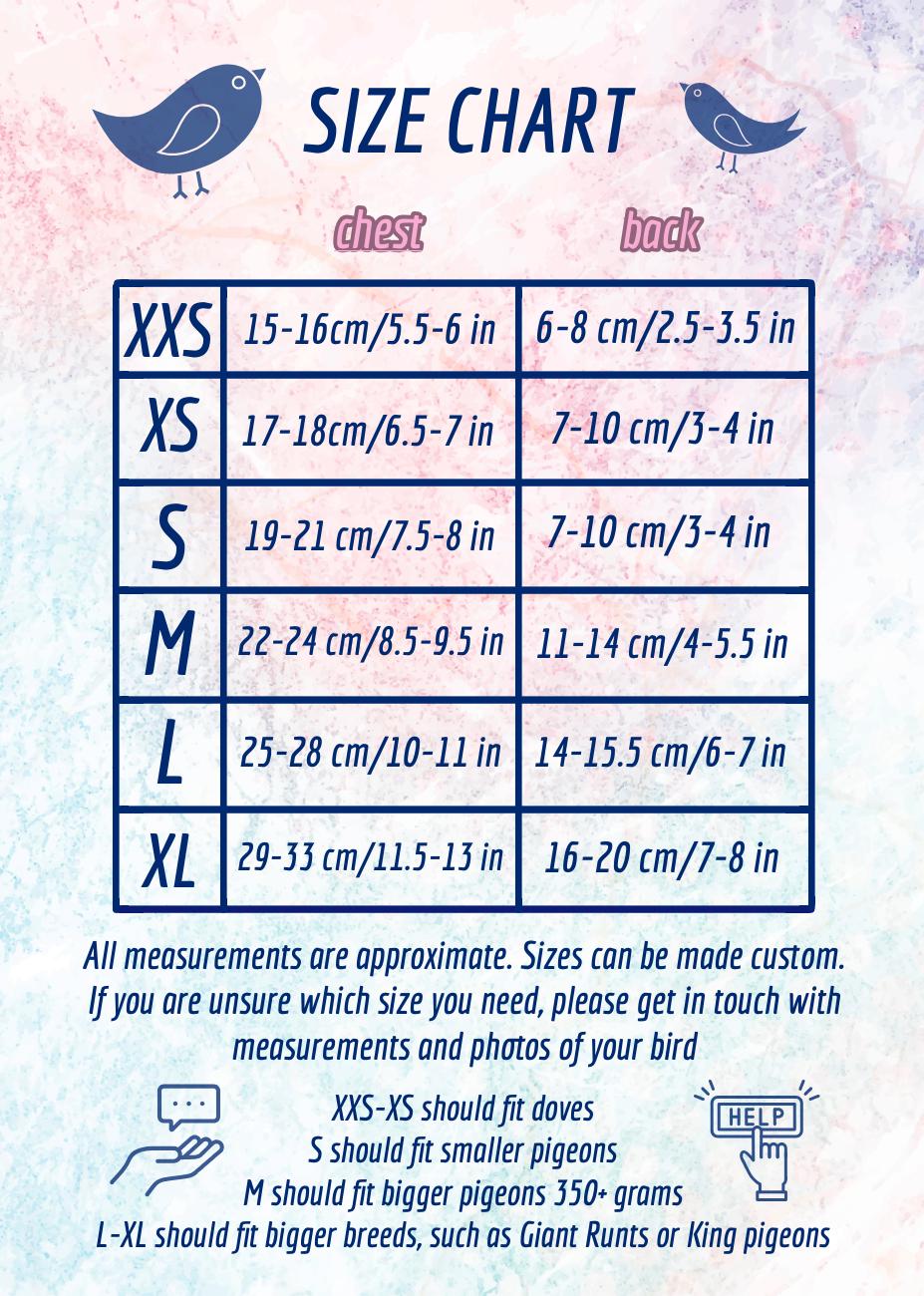 To figure out the right size, it is best to measure your bird. Consult the measuring instructions and the size chart in the photo gallery. If you are unsure about the size you need, don't hesitate to get in touch!